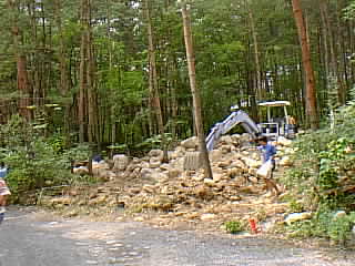 | 林になっていた建設地は、この日までにおおよその木の伐採が済んでいました。木を切ってみると天空の青空が広がり、日中は暑いほどの日当たりです。デッキでのんびり日光浴もできるでしょう。 地盤は近くに川が流れているため、予想通り川石がごろごろ出てきました。建材、及び外構に利用できる物は利用し、基礎はこの地盤を生かしたべた基礎とします。 |