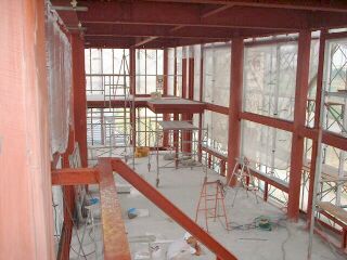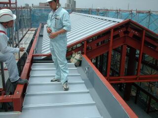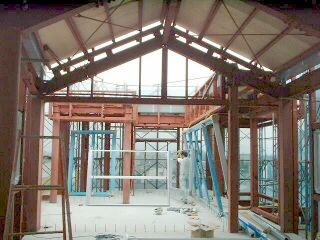 屋根、床が出来上がりました。スケルトンの状態で鉄骨仕口等の検査を行います。必要に応じて補強工事を行います。